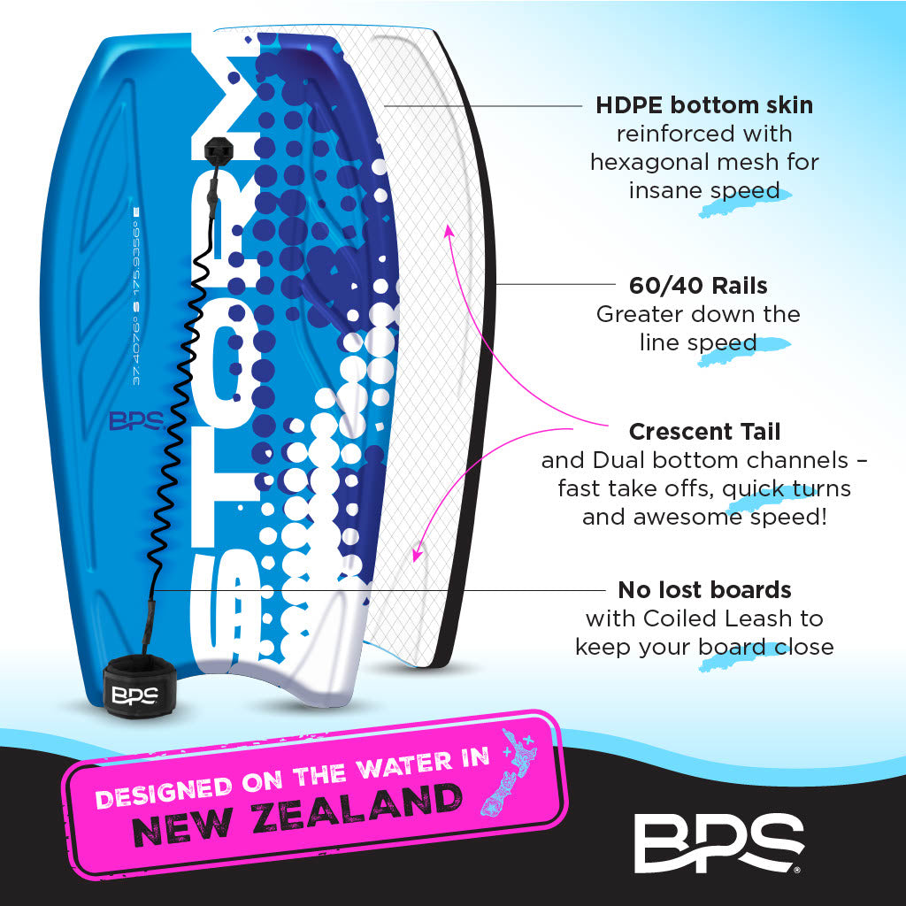 EXPECT HAPPY FACES AND LIFELONG MEMORIES 🤗 Designed for PEAK Performance, the Storm PRO Body board has a Pro grade IXPE Deck Thermo fused to an Ultra lightweight EPS Core with an embedded fiberglass stringer. Our deck shape helps you nail the all-critical hand and elbow placement, while the fiberglass stringer adds strength, and an HDPE bottom skin reinforced with hex mesh means insane speed. Expect balance, maneuverability and speed in all wave conditions for riders up to 200lbs.