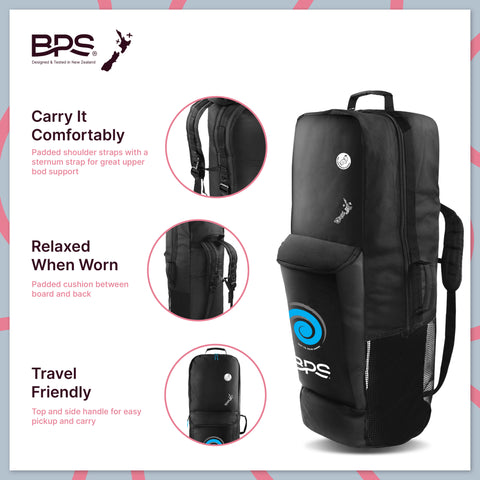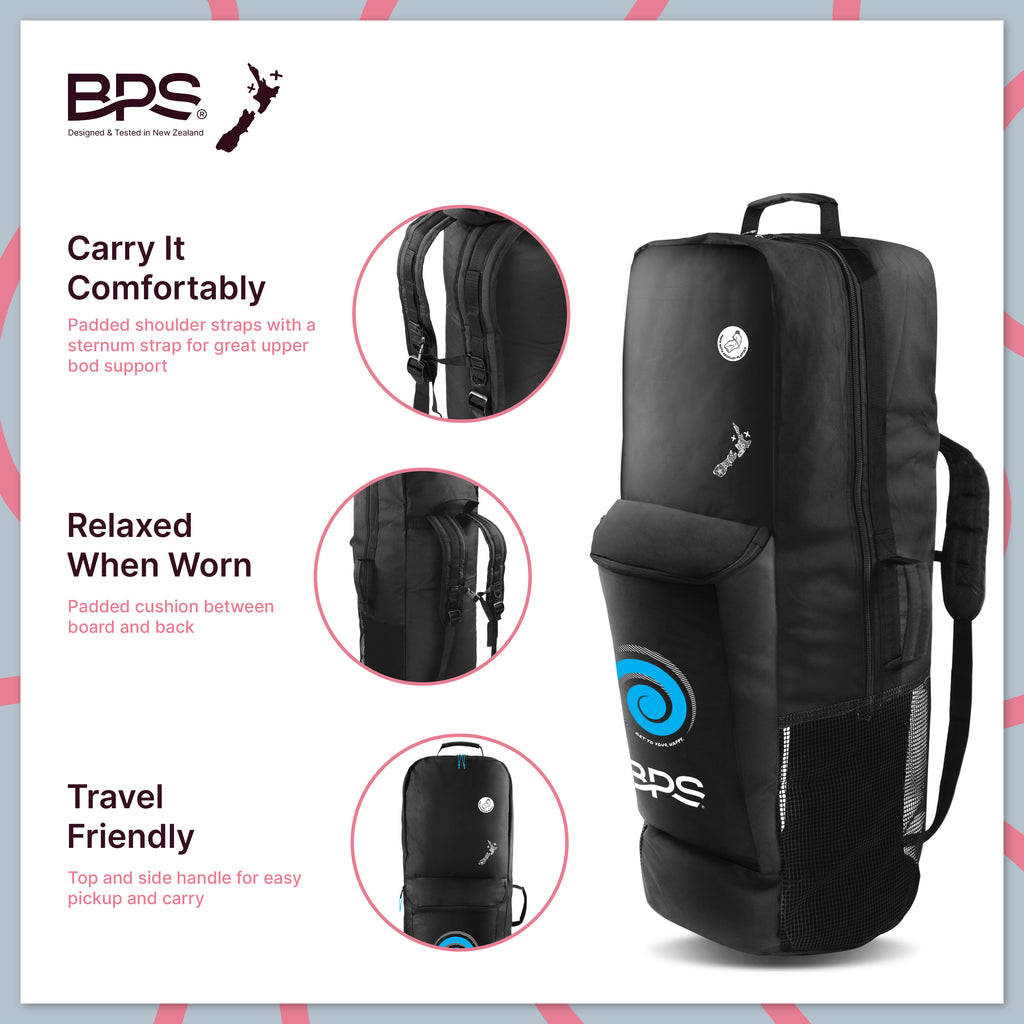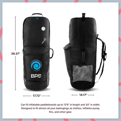 EASE & COMFORT - Carrying your board is made easier. This bag allows you to wear it like a backpack or hand carry using the padded side handles. It also has padded shoulder straps with a large adjustment range (fits a 30 to 46-inch chest), a chest strap, a padded layer between your board and back for extra comfort, an internal rear pocket with sealable Velcro, and two heavy-duty zippers. The rear pocket is designed large enough to fit all your extra stuff.