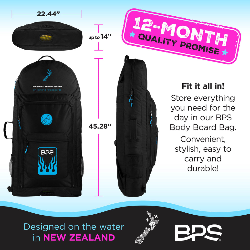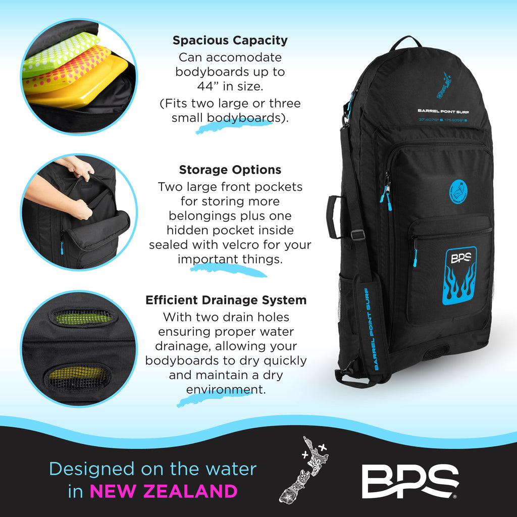 Made from Recycled Plastic Bottles. Store and transport your bodyboards and beach accessories safely wherever possible. This bodyboard bag has the capacity to carry up to 3 bodyboards at a time - also comes with lots of extra pockets for your accessories!