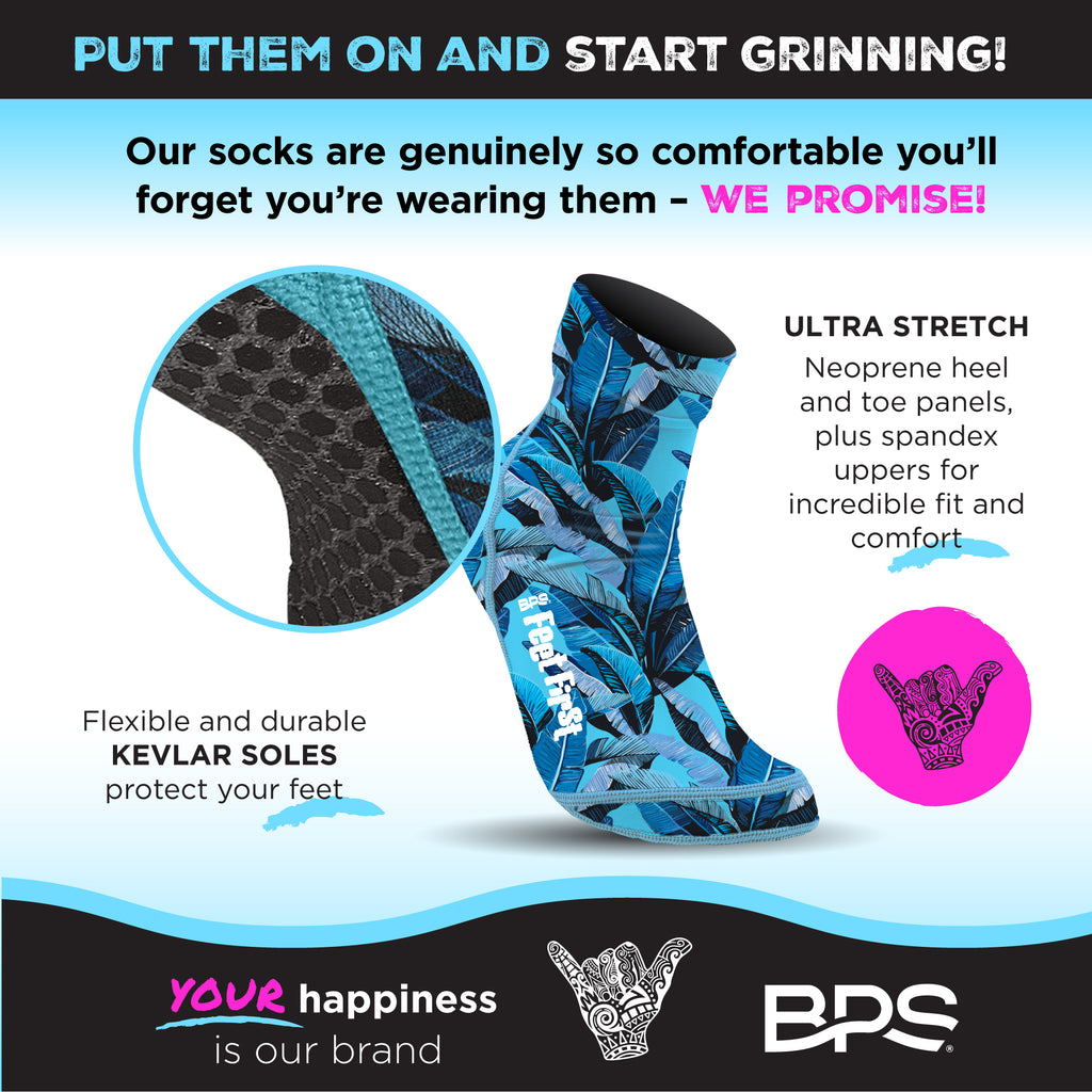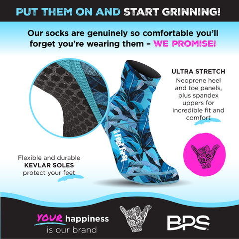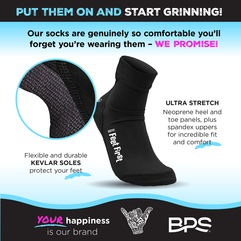 STOP DOING THE HOT SAND DANCE 😃 You can play all day on scorching sand while everyone else hops from one foot to another. The new BPS beach socks have flexible but durable Kevlar reinforced sole provides protection from shells, rocks, coarse and hot sand. These aqua socks are designed to be thin and lightweight, made from high-quality elastane for flexibility and a ‘barefoot’ feel. Ideal for narrow to average-width feet—if you have wide feet, consider sizing up!