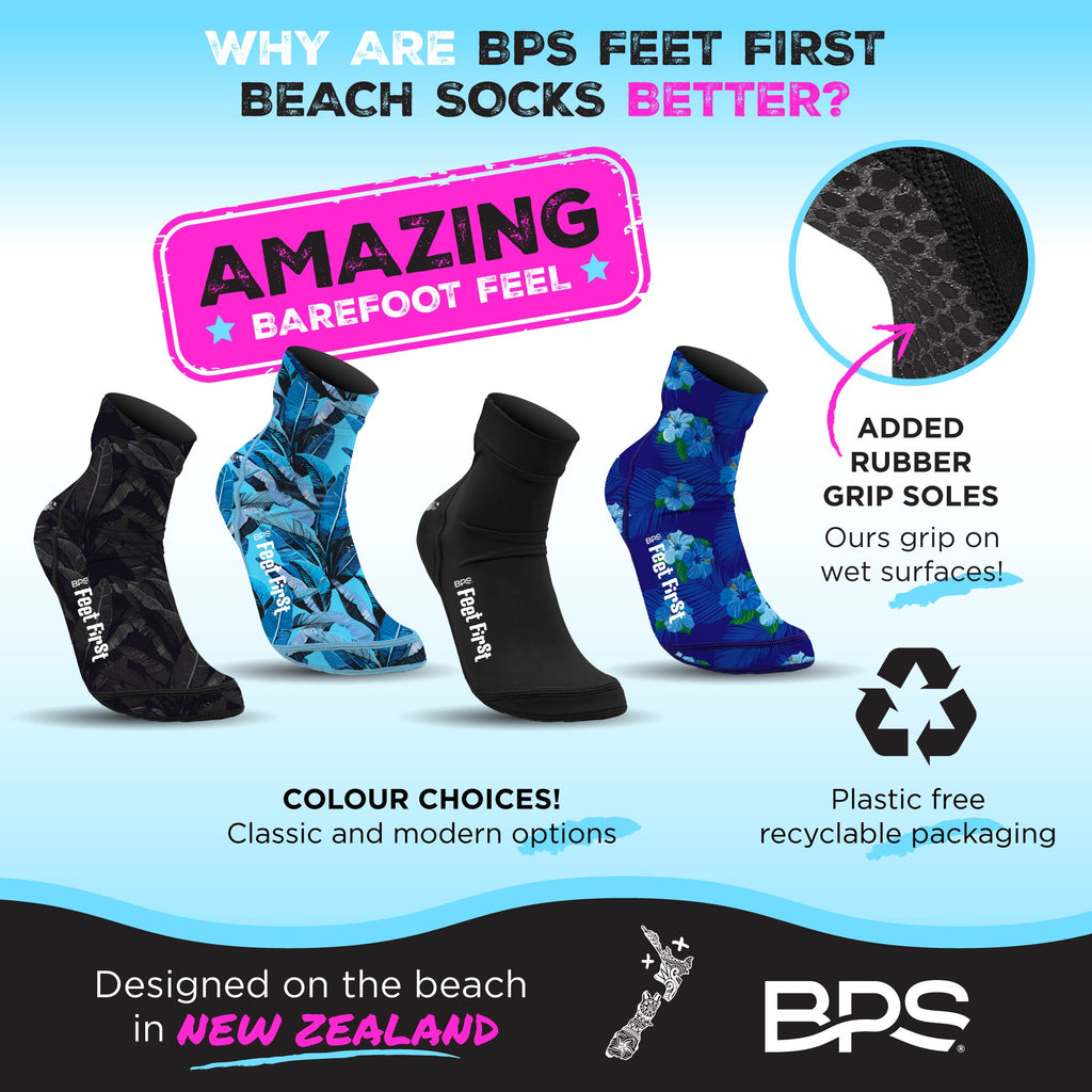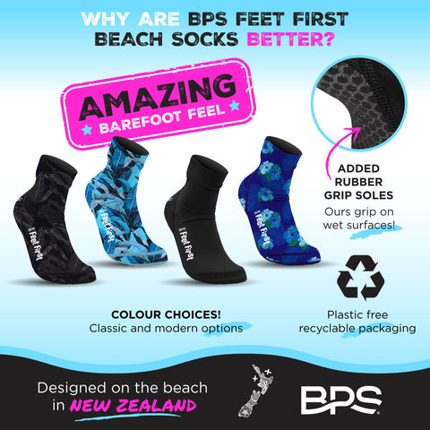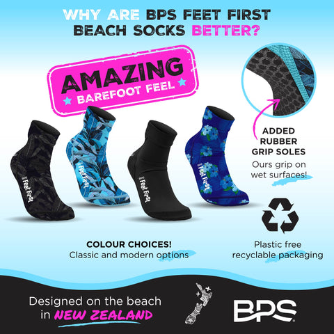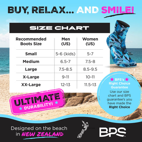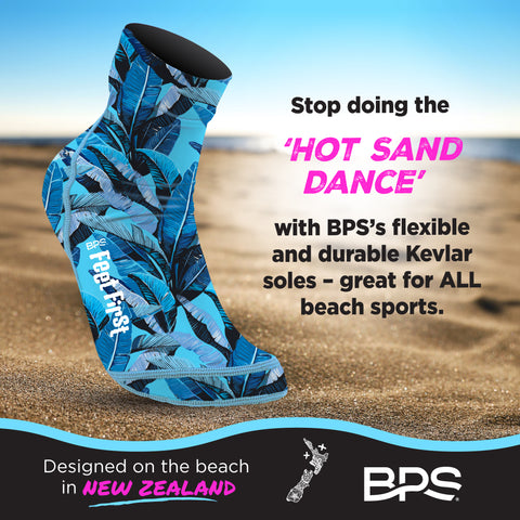 PUT THEM ON AND START GRINNING 😎 Our swim booties are genuinely so comfortable you WILL forget you are wearing them. (We promise!). Just pick any sport played on the beach (Beach Volleyball?, Sand Soccer?) and these will work for you. Designed and tested on New Zealand beaches, BPS guarantees that they do what they are supposed to.