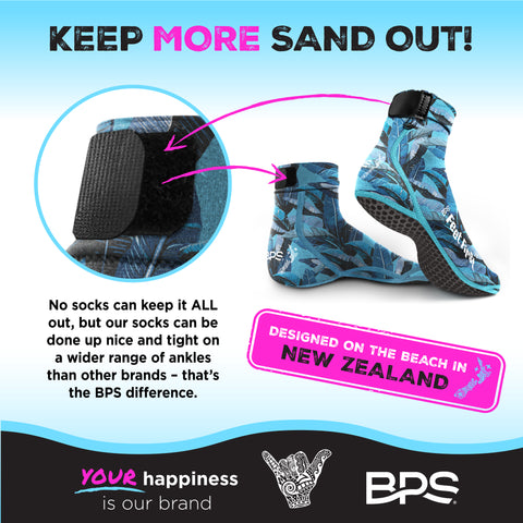 KEEP MORE SAND OUT! 😎 No beach volleyball socks can keep it ALL out, but our socks can be done up nice and tight on a wider range of ankles than other brands. A good tight fit minimises sand entry – that’s the BPS difference. We’ve even added a grip to the soles of some styles for traction on slippery surfaces.