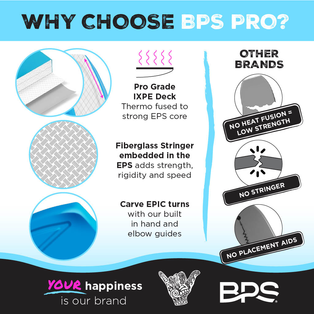 Features: Pro Grade IXPE Deck, Fiberglass Stringer embedded in the EPS, Optional Carry Bag
